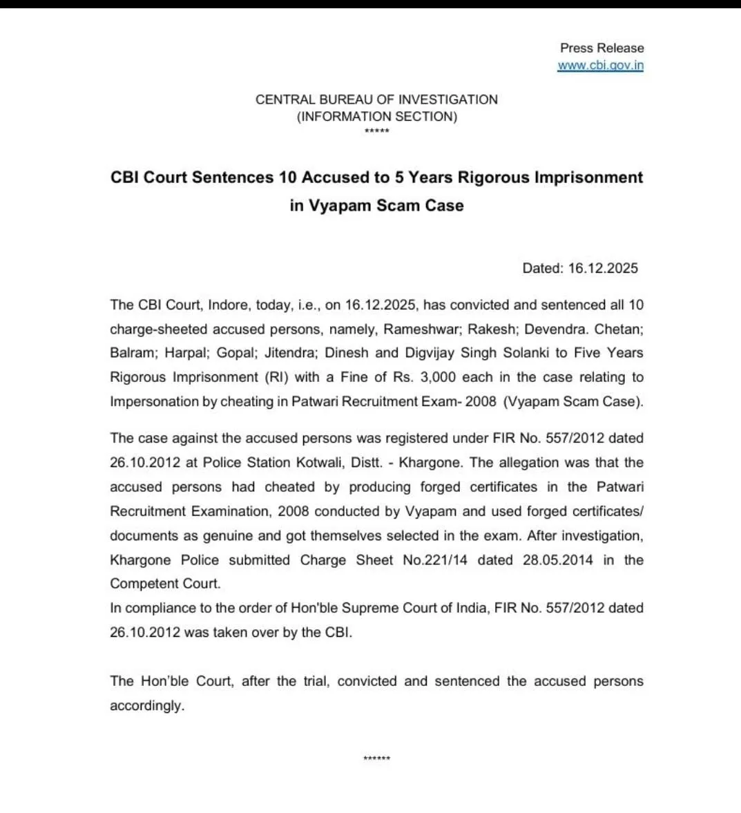 सीबीआई स्पेशल कोर्ट ने 16 दिसंबर 2025 को व्यापमं घोटाले के 10 आरोपियों को सजा दी है। इन आरोपियों में रामेश्वर, राकेश, देवेंद्र, चेतन, बलराम, हरपाल, गोपाल, जितेंद्र, दिनेश और दिग्विजय सिंह सोलंकी शामिल हैं।